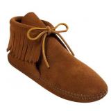 Minnetonka Women's Classic Fringed Bootie - Brown - Size 8. Medium width. Suede upper. Softsole outsole. Fringed collar. 4" boot height. Tie closure with rawhide laces This item is NEW!! In retail shoe box. Retail Price: $42.99 |