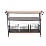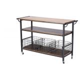 Baxton Studio Lancashire Wood and Metal Kitchen Cart, Brown Dimensions: 47.6 x 17 x 31.4 inches. 56 lbs. Vintage industrial rustic design kitchen cart. Distressed wood top and shelf with ash veneer. Framed in durable rustic iron metal in bronze. Metal wheels provide the convenience of mobility. Item is in original retail package. Assembly required. NEW! List Price: $351.00 <76> |