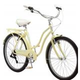 Schwinn Ladies Perla 7 Speed Cruiser Bicycle 26" Wheels Schwinn steel Women's step-thru cruiser frame and fork offers a comfortable riding position that's easy on your back. 7-Speed twist shifters with Schwinn rear derailleur for smooth shifting. Alloy linear pull brakes for secure stops. Schwinn quality cruiser spring saddle adds comfort to your ride Full wrap fenders add style while keeping you clean and Dry; convenient rear rack carries your belongings. Item is in original retail package. Assembly required. NEW! Retails for $199.99 |