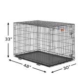 MidWest iCrate Single Door & Double Door Folding Metal Dog Crates Single door folding metal dog crate, iCrate measures 48L x 30W x 33H inches & is suitable for XL dog breeds. Two heavy duty slide-bolt latches (per door) securely lock dog crate door in place keeping your dog safely inside their pet home. Folding metal dog crate assembles easily w/out tools & folds flat for convenient storage, travel & portability inside & outside your home. Item is in original retail package. Assembly required. NEW! Retails for $109.99 |
