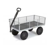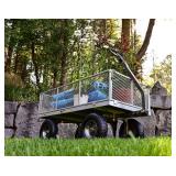 Gorilla Carts Heavy-Duty Steel Utility Cart with Removable Sides with a Capacity of 1000 lb, Gray Durable 49-inch x 24.5-inch steel mesh bed and 13-inch pneumatic tires. New frame design allows for quick and easy assembly while offering improved maneuverability, rigidity, and ground clearance. Removable steel mesh sides for added versatility when carrying larger loads. Padded 2-in-1 convertible handle can be pulled by hand or towed, making it easy to pull up to 1000-pounds. Item is in original retail package. Assembly required. NEW! Retails for $159.05 |