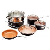Gotham Steel 10-Piece Nonstick Frying Pan and Cookware Set - Graphite. GOTHAM STEEL 10-Piece Kitchen and Cookware Set About the Product Gotham Steel is the first product of its class to actually utilize high-grade titanium and ceramic as surface finishing. This sophisticated combination not only ensures maximal durability it also allows for multi-functional, all-around usage. Titanium plus Ceramic Coating FAQs High-heat threshold to sear perfectly browned steaks! Everything just slides right off, even burnt chocolate and cheese. Food flavor is not altered when cooking tomato-based or any acidic food products thanks to the ceramic component! The non-stick surface cleans easy! Versatile: for stove-top cooking, or baking! Rust-proof all over. Coating doesn't peel off with constant usage and washing. New in Factory Box. Retail $199.99. |