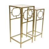 Decor Therapy Gold Class Accent Table Set Glass top Champagne finish Gold finish Easy assembly Ships quickly Includes 2-side tables Table 1 size: 13.25 in. W x 13.25 in. D x 30 in. H Table 2 size: 10.5 in. W x 10.5 in. D x 26.75 in. H In retail package. Retails for $125.42 <48> |