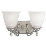 Progress Lighting Renovations Collection 2-Light Antique Nickel Vanity Light with Etched Glass Shades Fixture can be installed facing upward or downward Uses two 100-Watt maximum standard base bulbs (not included) Dimensions: 14 in. W x 8-1/8 in. D x 8-1/4 in. H In retail package. Retails for $113.22 |