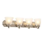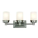 Hampton Bay Transitional 3-Light Brushed Nickel Vanity Light with Frosted Glass Shades Contemporary brushed nickel finish complements many decors Uses three 60-Watt bulbs, sold separately Update your bathroom decor, install as an up-light or down-light In retail package. Retails for $64.97 |