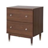 South Shore Olly 2-Drawer Brown Walnut Nightstand. Its finish, imitating old hand-crafted wooden boards and its wooden legs will add the perfect touch of originality to your bedroom. Appears to be new in Original Carton. Please attend the Preview to see the item for yourself. Retail $157.49