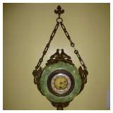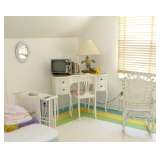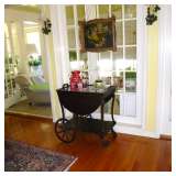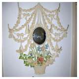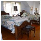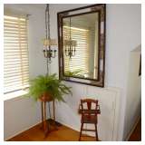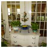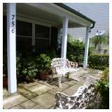 Victorian parlor set, Victorian and Empire furniture, boudoir benches, pair mahogany twin beds, loveseat/chair, tea cart, wicker furniture, assortment of clocks including Regulator, French enameled 2-sided wall clock, mantle clocks; kitsch decoratives such as metal floral arrangement, Hollywood Regency cast iron hanging coat tree, chandeliers and lamps and more. Also bronzes, set of Metlock daisy china, depression glass, assorted vintage glassware, paintings, decorative prints, cedar chest, collection of designer stuffed bears, sterling silver tea set, some dollhouse furniture, fox coat, kitchen items and more. Also wrought iron benches and many large potted jade plants. |