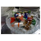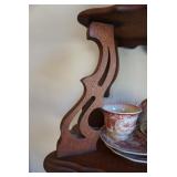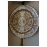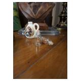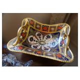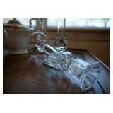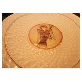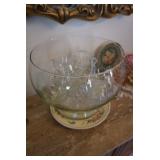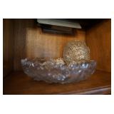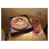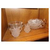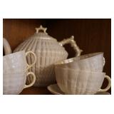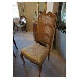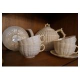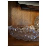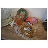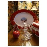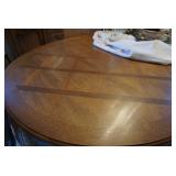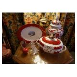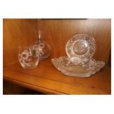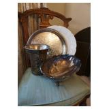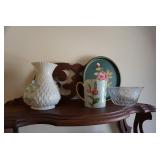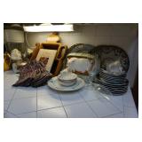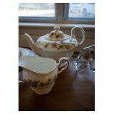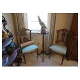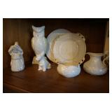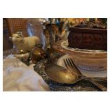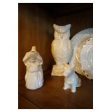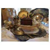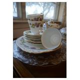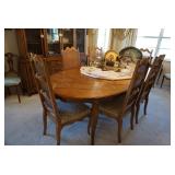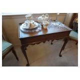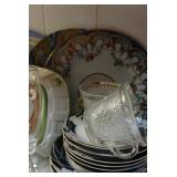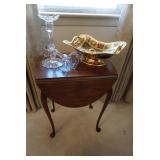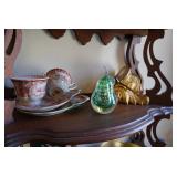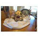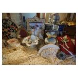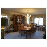 Formal Dining White fine furniture- French Provincial lighted china cabinet Dining Table with 2 leaves and 6 cane back chairs Heritage buffet with marble top Vintage small drop leaf table Vintage tea table Set of 4 ornate vintage side chairs Art Stained glass Belleek china Silver plated serving pieces Parrot candle sticks (2) Marble pedestal Pink depression glass cream and sugar Large punch bowl with ladle Vintage linens Paragon china- Highland Queen Dessert plate/cup sets Crystal Cut glass Decorative metal trays Assorted china plates Large milk glass platter- Grape pattern Pink depression glass footed bowl Flatware Pedestal plant stand Large ceramic parrot Vintage shelving Decorative lamp Pickard china Candlesticks Assorted décor Cake stand