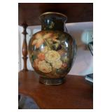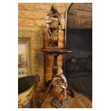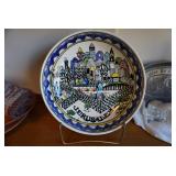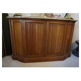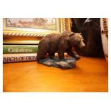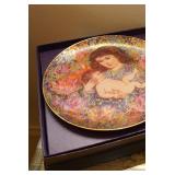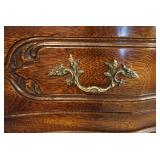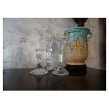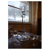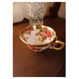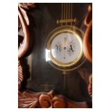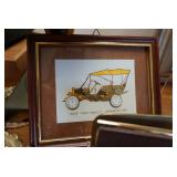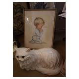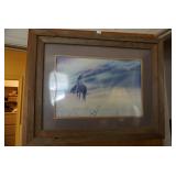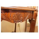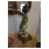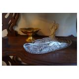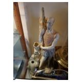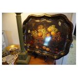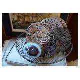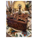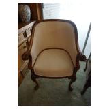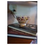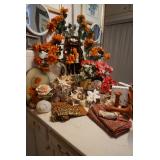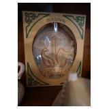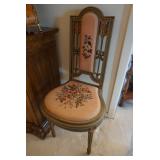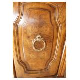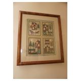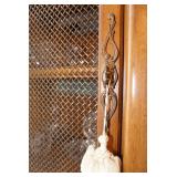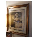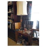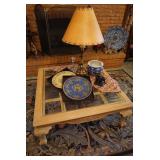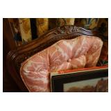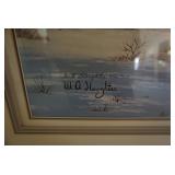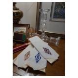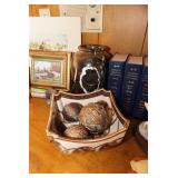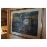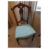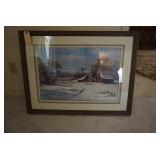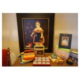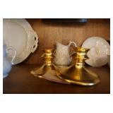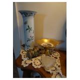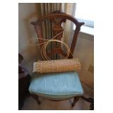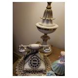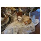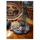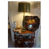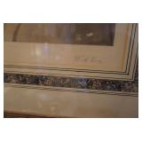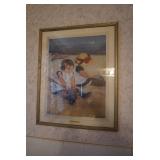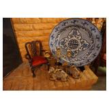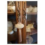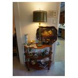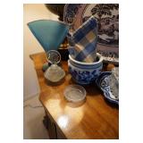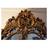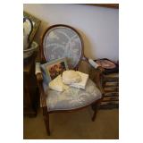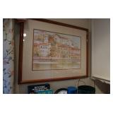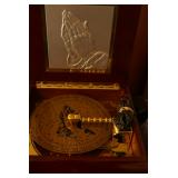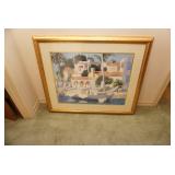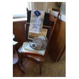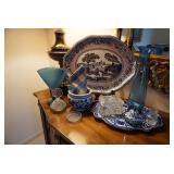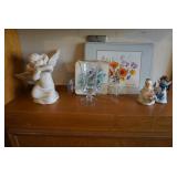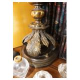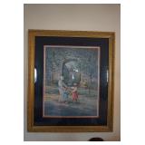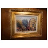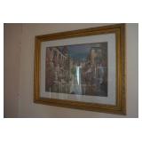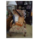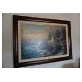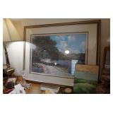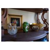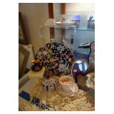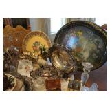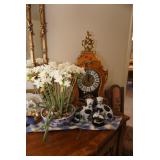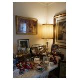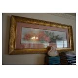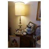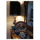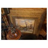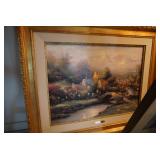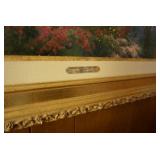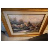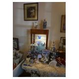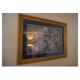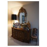 Checkout Area Heritage Buffet Ornate antique chair with needle point seat Ornate antiqued brass lamp with black/gold shade Daner decorative tray cut glass perfume bottle Very ornate gold mirror Studio Paran art glass blue/white décor Crystal box Blue/White bowl with silk paperwhites Italian made ornate clock with inhale wood and brass accents Art- Thomas Kincaid William Slaughter L. Gordon