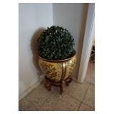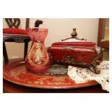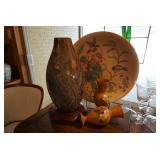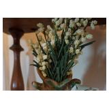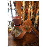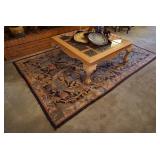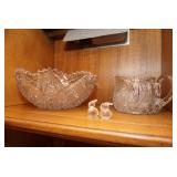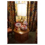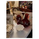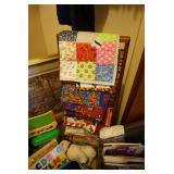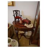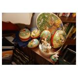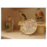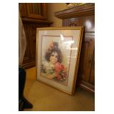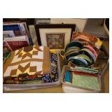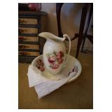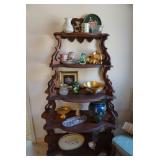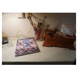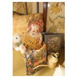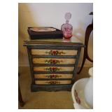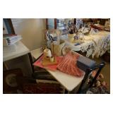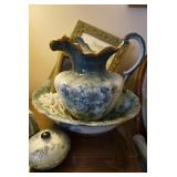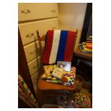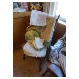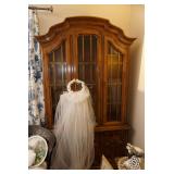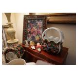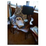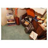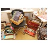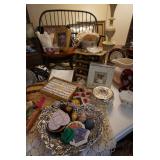 Bedroom 1 Large lighted display cabinet with side doors Ornate china cabinet Hand painted 5 drawer table Victorian style cherry side tables Hand painted chair with rush seat Coffee table Fabric and sewing items Jewelry boxes French provincial lamps Frames Floral décor Crochet needles in case Fold away sewing table Pfaff creative 7570 sewing and embroidery machine Vintage toys Lap quilts Wash bowl and pitcher set (2) Magazine rack- Ethan Allen Tons of art Vintage wedding veil Needlepoint fireplace screen Lots of vintage décor Asian inspired area rug Art supplies Boehm figurines Lenox collectible bird figurines Bankers lamp