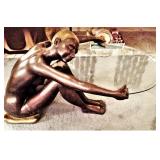BRONZE NUDE HOLDING AN OVAL GLASS TOP COFFEE TABLE