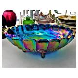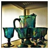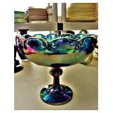 BLUE CARNIVAL PITRCHER AND GLASSES SET, FOOTED FRUIT BOWL, PEDESTAL CANDY DISH