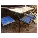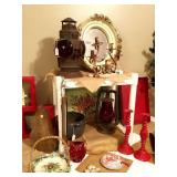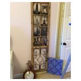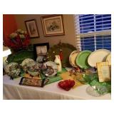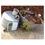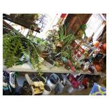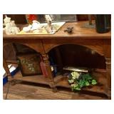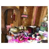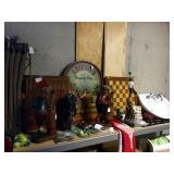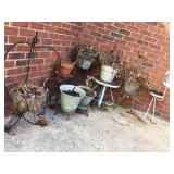 Furniture: Large metal wine storage closet 2 three tier metal folding shelves Entry sofa table Round claw foot table & 6 spindle back oak chairs Large ornate antique mirror Great patio & porch furniture- marble top with metal base table & 4 chairs, pair of metal and fabric lounge chairs, fire pit, heavy metal patio side table, large patio table with six arm chairs and captain chairs that swivel, many flower pots, pair of concrete statues, lots of yard art, fountain, 2 Sun Cast hose reels with hoses Texas wood ice chest on legs Pair heavy vintage patio chairs Dark wood bookcase with doors Dark wood lateral file drawers Dark wood Louis Philippe Curio Executive desk Dark wood credenza hutch Brown leather top end table Round wood pedestal table to paint Keg on stand Long wood credenza Gaming chair & game systems & games Low kid's play table File cabinets Pedestal metal table with Formica square top 2 Baker's racks Antique upholstered rocker - as is Three tier pink metal stand Five shelf what not stand White art deco dresser Pine dresser with triple mirror Large white wicker rocker Blonde cabinet with drawers and door with shelves Black three drawer chest of drawers Black mid century modern kneehole desk Pine chest on chest Walnut antique side chair