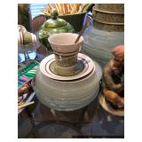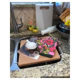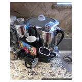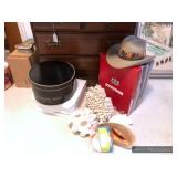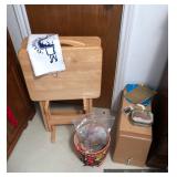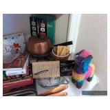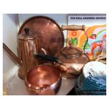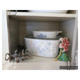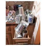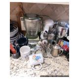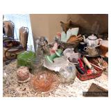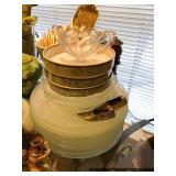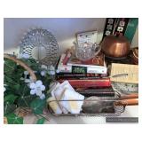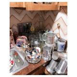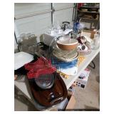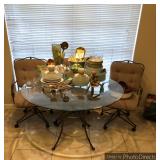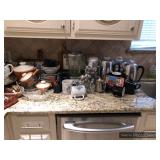 Kitchen Round metal dining table with glass top and 4 swivel chairs Kenmore Elite stainless-steel refrigerator Wedgewood china – Tuscan Harvest Noritake china – Moon Valley Noritake china – Primastone Vintage mid-century modern wall art Frosted glass dinnerware Wooden salad bowl sets Tons of cookbooks Vintage fondue sets – enamel, copper, brass/wood, pottery Vintage gold plate flatware set Vintage stemware Vintage cake plates Vintage aluminum cake cover Vintage milk glass hen on nest Vintage pink depression glass Kitchen utensils Cutlery Pots and Pans Bakeware – muffin tins, cake pans, springform pans, loaf pans, cookie sheets, pie plates Rolling pins Sifters Mixing bowls Cutting boards Pyrex Corning Ware Kitchen timers and thermometers Vintage coffee percolators Vintage GE blender Hand mixers Colanders Aprons Coffee mugs French press coffee set Creamer/sugar sets Cheese boards with domes Assorted china plates Copper teapot, coffee pot, and tray Baskets Brass décor