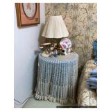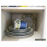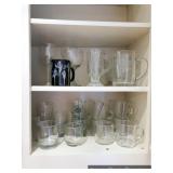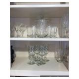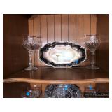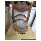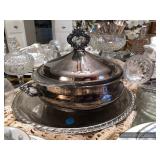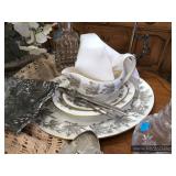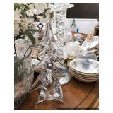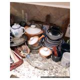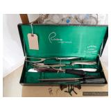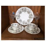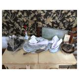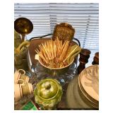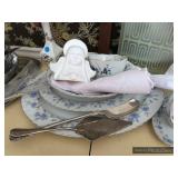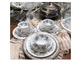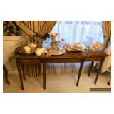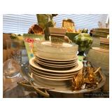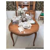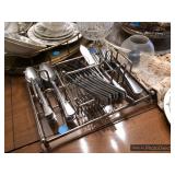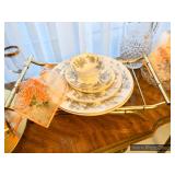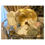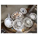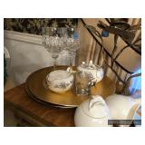 Formal Dining Room Thomasville dining table with 2 leaves and 4 chairs with needlepoint seats Camille by Thomasville lighted china cabinet French country serving buffet Brass/glass serving cart Sofa table Wedgewood china – Ashford Silver plate serving pieces Crystal and cut glass Stemware Flatware Plate chargers Vintage linens Vintage Sears electric warming tray Small ornate mirror Vintage brass floral candelabra Riviera Samurai cutlery set with case Krosno ice bucket Baskets