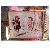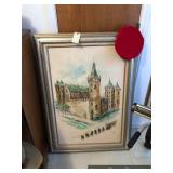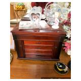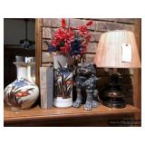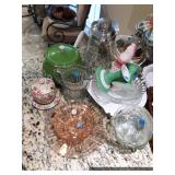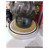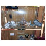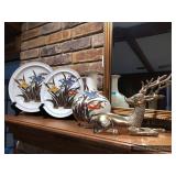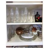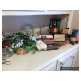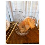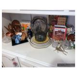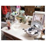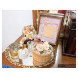 Hallway Large ornate frame Beautiful cut glass footed bowl Milk glass lidded jar Assorted décor Books