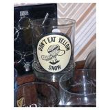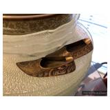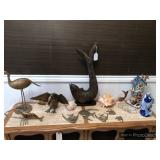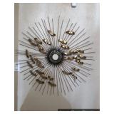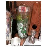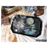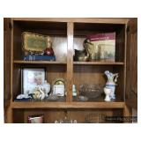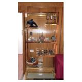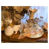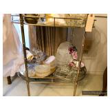 Den Modern brass/glass shelving unit Beautiful brass coffee table with marble top Ornate gold framed mirrors Sony projection television Large blown glass flowers Large lamp with cherub base Decorative trays Cut/etched glass décor Brass décor Vases Decorative plates Pottery Silver plate goblets Vintage barware Shot glasses Bar utensils and accessories Wooden tiki mugs Vintage ice bucket Cocktail recipe books Steins and mugs Coasters Matchbooks Books Art