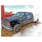 1996 Chevrolet 3500, 201,493 miles, 2WD, V8, gas, auto, crew cab, with contractor's box, 225/75R16 dually, VIN 1GCHC33JXTF021178