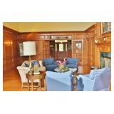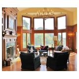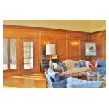 Living Room - 27' x 18' with oak floor, custom woodwork, wood burning fireplace, wet bar with brass sink, brass chandelier, huge windows and door to outside