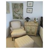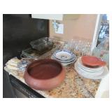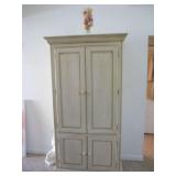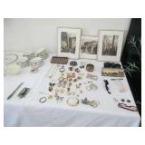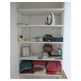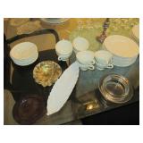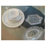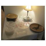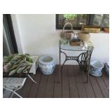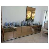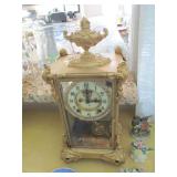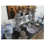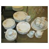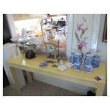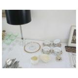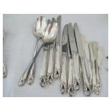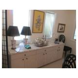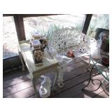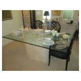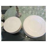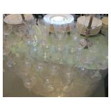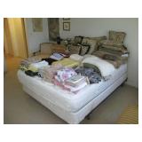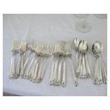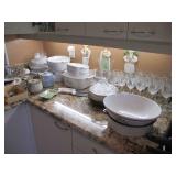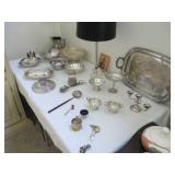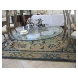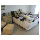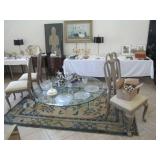 International Spring Glory Sterling flatware, several sterling pieces, oriental screen, 3 glass cabinets, pair French chairs, 2 wardrobes, Wedgwood Wellesley China, 2 additional sets of china, silver plate tea set and other items, Asian panels, glass dining table & chairs, pair end tables, large glass coffee table, set of Fostoria stemware, other glassware, framed art, lighted stand, Ansonia French style shelf clock, fur coat, china cabinet, queen bed, Victorian settee, chest, occasional chairs, dining chairs, jewelry, TV's, linens, mirrors, pictures, shag area rug, full kitchen, Calphalon pans, 2 sets silver plate flatware, patio set, vintage Singer sewing machine base, treadmill & garage items |