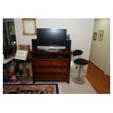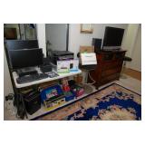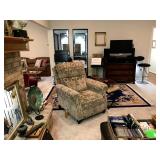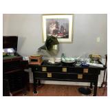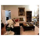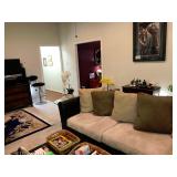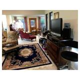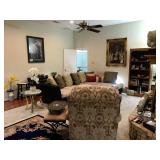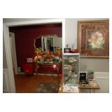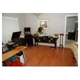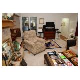 Livingroom – features Mango Grove Entertainment and Storage Drawer Chest. We have assorted Bibles, a nice 6’ x 9’ wool rug (cleaned) with fringe on the ends. The dominant color is navy blue. There is a nice push back recliner in a multi-colored beige pattern. We have a nice beige bench and a small wood tray with pearled insets. There is a two piece (they hook together) modern lounger / “L” couch in beige and dark brown. Each section has four large pillows, and the two sections will be sold together. Then there is a large square dark brown covered Ottoman / Table (sold separately). We have a nice square beveled glass side table with gold tone legs. We have a Basset solid wood Book shelf in great condition. We have some very interesting books and coffee table books. How about a large vintage “Far East” silk screen mounted in a large gold carved frame? The silk screen is comprised of shades of browns and beige with seven dancers among trees. We have an unusually nice Geisha Wig with head and carrying case. This Wig comes with more hair accents and a red hair comb. We have two Dell Monitors and a keyboard. There is also a Ativa LD 800 Shredder, a MacBook Case and a New National Geographic Telescope in original box. We have an Epson color printer. There is a pair of Pioneer speakers, and a Sony Time Link Digital Delayed Dolby Surround Audio/Video Control Center. We also have a Kenwood Direct Drive Full Automatic Turntable, model; KD-78F. There is a new in the box Semper Radio Alarm Clock and an Envision 32” LCD 1080i (HDMI) Flat screen HD TV with remote. There is a MacBook Pro laptop “Core 2 Duo” with 250 GB HDD, 4 GB RAM and 256 MB with an 8x DL “Super Drive”. There is also a Toshiba Satellite laptop; Model L305D Windows 10 professional. The Toshiba Laptop also has a 64 bit TL60 2 GHz CPU, 4.0 GB Ram, Ethernet port, Wireless card and a Webcam. It has a 250 GB Hard drive. We have a nice entry chest with four drawers for storage and two matching wood rectangle stools. There are two Orchard Floral Plants with nice pots. One has yellow orchards, and the other has white Orchards. We have CD’s and DVD’s. Some are multiple disk sets. We have a nice gold framed painting of women with a little girl; this painting comes with an overhead light. There is a nice framed Secret Gardens print by Lena Liu. We have a head sculpture of Michael Angelo’s David and a head sculpture of Pythagoras. At least we think it’s of him. We have lots of interesting knick-knacks in this room, so come early for the best selection.
