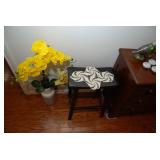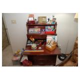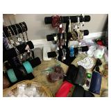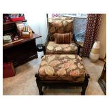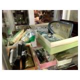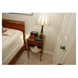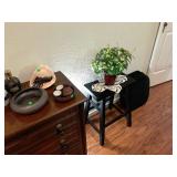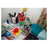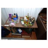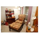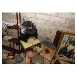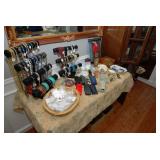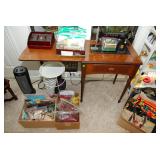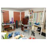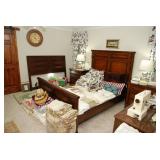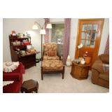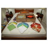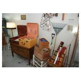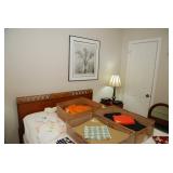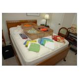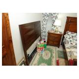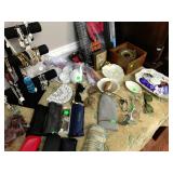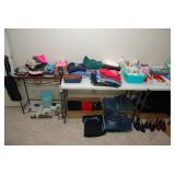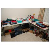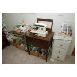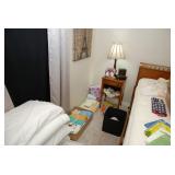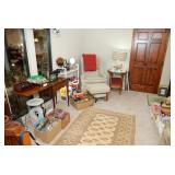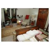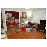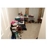 Master Bedroom – features a very nice Queen tall headboard & footboard from Mango Grove including the wood rails and a platform. All you need to add is your own mattress. There are also two matching night stands with drawers making great storage. We have two matching Lamps with shades (BNI) and some interesting knick-knacks. We have a nice Kenmore Ultra Stitch 12 sewing machine in a nice wood cabinet with attachments. There is also another wood headboard on another wall in this room. We have bedding for a Full, Queen and King beds. There is a nice wingback chair, ottoman and foot stool with matching striped fabric. We also have a round vintage Oak table and a nice lamp with shade (BNI). We have some toiletries and vanity items including a hair dryer, curling irons, jewelry cleaners, a lighted magnifying mirror, and wig stand w/wig. We have some nice bar soaps and an electric tooth brush. There are two rugs. One is a small area rug, and the other is more like a small runner. There is a nice jewelry box with a flip open top revealing a mirror along with a heavy duty wood valet. We also have another sewing machine in a wood cabinet: a Singer sewing machine; model # AH602872. It seems to be in excellent condition. We also have some purses, throws, gift bags, and small bathroom/entry rugs. If you are looking for sewing notions and craft items, there are lots, and most are in small bags that are individually priced. This room is crammed full of interesting items, so come early for the best selection.