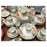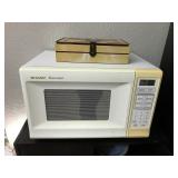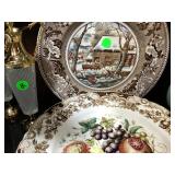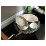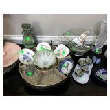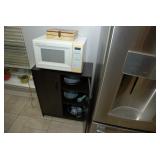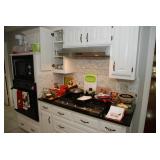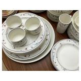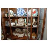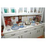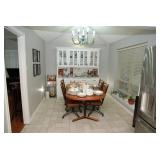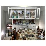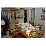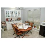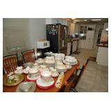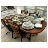 Eating Area – features a nice oval table with one large leaf. It has four chairs that are on casters with black ascent. We have a lot of different size Asian bowls (small to large) in assorted colors. We have a vintage Sharp microwave carousel oven that works great and is sitting on a nice two-door storage unit. We have some succulent plants on the window sill. The built in hutch/buffet holds a lot of interesting and unique serving items, bowls, plates, platters, and dishes for the kitchen. We have a nice chicken theme going as well. The table holds lots of dishes including two sets of Mikasa dishes. One set is a pattern of Intaglio CAC20 Annette and the other larger set is Heritage CA804 Orchard Odyssey. We have a plate and bowl set by Pioneer Woman.