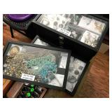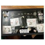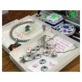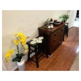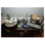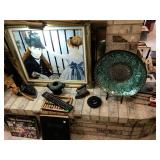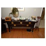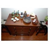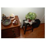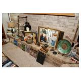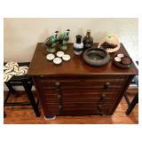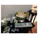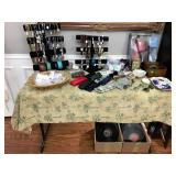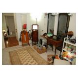 Entry / Dining Room / Checkout Area – features a great half circle entry table made of wrought iron with a beveled glass top. It has two identical lamps (BNI) with grapes on the shades. They are very nice. We also have some nice oversized hand fans with unique designs on each side, and a great floral arrangement. There is a nice Ethan Allen two piece lighted hutch. This hutch is in great condition and has wood shelves with plate grooves and glass inserts. Inside the hutch we have some Johnson Brothers “Windsor Ware” plates made in England (Hand Engraving). We have another Johnson Brothers plate: Thanksgiving, Historic America from England. We have a set of Langley Dishes Made in England. There are also two oval plates called “Game Birds” a hand engraving made in England by Johnson Brothers called “Woodcock.” We have two vintage 1950’s Flamingos (one small and one medium). We have a nice James Dean hard covered book and a James Dean doll still in original packaging. We have a vintage Gimbal Maritime box compass by PEEL Street Company and assorted eye glasses. Some are vintage. The jewelry corner at checkout is loaded with interesting jewelry including sterling silver - some by designers like: L/L Dickson, Ivana Trump, Melanin Trump, Adrienne, Jewelry TV, Lauren G. Adams, Technibond and Rebecca. We also have some pearls and lots of sterling silver (.925) pieces including earrings, rings, bracelets, pins, pendants and necklaces. There are also some stone necklaces in many colors of Jasper and other hand painted and hand-made items. If have some gold jewelry (mostly rings), and we have an assortment of costume jewelry including necklaces, pins, bracelets, and earrings. We have a nice collection of stamps (in binders), coins, vintage and current perfumes and colognes (mostly partial bottles). In addition we have a larger glass case full of small collectables such as: boxes, pens, quill pens, (and lots of quill feathers), pocket knives, vintage compacts and small boxes. We have some Limoges including glass and crystal perfume bottles. Prepare to wait a few minutes for personalized service in the jewelry area or to inspect items in the large case while we wait on one person at a time. We have two large vintage floor Victrolas and one tabletop unit with large speaker horn. We have lots of great 78 RPM records. We have an interesting Asian style log buffet with nice brass handles on the drawers. You will notice an Asian flair when it comes to dishes and accent pieces. Come early for the best selection.