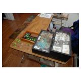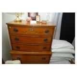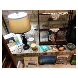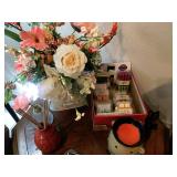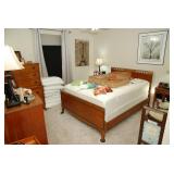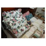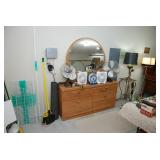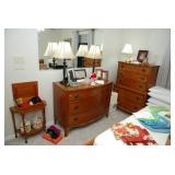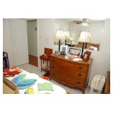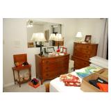 Corner Bedroom – features some pictures on the walls and a nice bedroom set. The bedroom set is made by Johnson – Handley – Johnson of Grand Rapids Michigan. There are two end tables and a full headboard & footboard with wood rails. We have a nice full mattress & box spring. The chest of drawers is in excellent condition with a total of five drawers. The dresser is a smaller size with three drawers. There is a nice mirror on the wall that is modern and frameless. We have two different pairs of lamps with shades (BNI) and a nice extension table / desk lamp with shade (BNI). There are lots of table linens on the bed in the boxes. We also have lots of bed pillows and some very nice vintage knick-knacks. There are also photo albums and vintage perfume trays along with a mirror and nice frames. There is a small area of baby and children’s items as well. Come early for the best selection.
