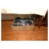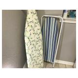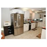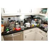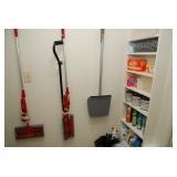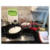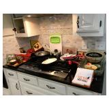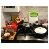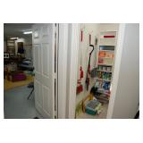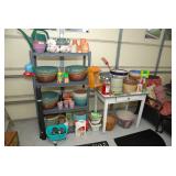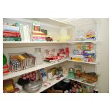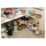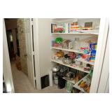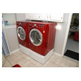 Pantry & Laundry Room – features a Red LG True Steam Washer and a Red LG Ture Steam Gas Dryer. Both are sitting on White Drawers that come with the units. We have two different types of Ironing boards. In the pantry we have some food that is new (not opened). We have some cleaning products (more in the garage), and some baking items, muffins, cookie, and cake pans. There are some racks with legs, trays, a basket, cook books, napkins, dryer mats, tea, and some vintage pans. There are stainless mixing bowls, trash containers, Styrofoam plates, and cups, Vintage juicer, Roasting pans with covers and more. We also have a vintage National Pressure Cooker (Wisc.) and a vintage Fry Pan with gauges in the cover.