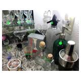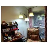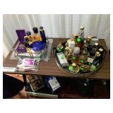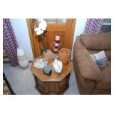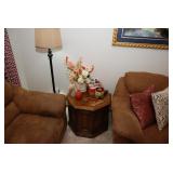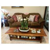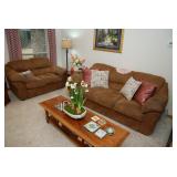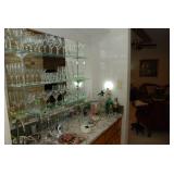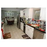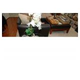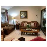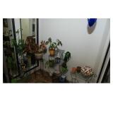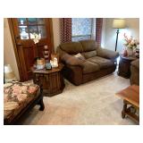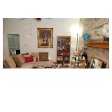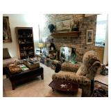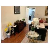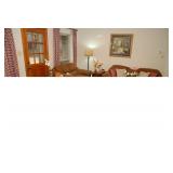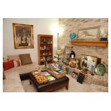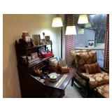 Family Room / Bar Area – features a nice couch and loveseat that match (priced separately) and wooden coffee table with drawer. We have a great fold-down desk. It’s two pieces, and it has a small double shelf that sits on top. The desk holds lots of office items. We have a great Floor Lamp with three adjustable lights and shades (BNI). We have a very nice arm chair with matching ottoman. The arm chair has wooden arms and frame. The ottoman also has a nice wooden frame. This two piece unit has a floral pattern in browns and peach making a nice addition to your home. For those who like the vintage look we have a great Victorian style Fainting Chase / Couch in Red with roll pillow. It’s in great condition. We also have a six-sided small vintage wooden table. There is also a nice small foot stool covered in leather with claw feet. We have two six-sided wooden end tables. Each has two doors that open for storage. There are some Knick-knacks and floral arrangements along with a few pictures. A glass door leads to the Atrium where we have live plants and succulents. Most of the plants are in very nice pots. There are also various black metal plant stands, small tables, a tiered stand, a table shaped like a cart, and single and double shelf stands as well. The bar area is home to assorted glasses (including shot glasses). We have a small floral arrangement and two nice Seltzer Bottles. One bottle is a vintage green bottle and the other is a clear bottle covered with wire mess. We also have coasters, assorted brandy, wine, and champagne as well as highball glasses. We also have some nice throw pillows and candles along with some picture frames.