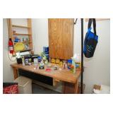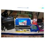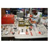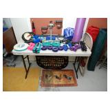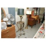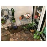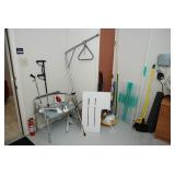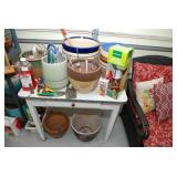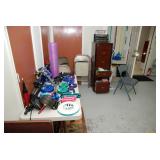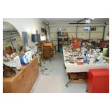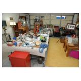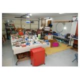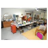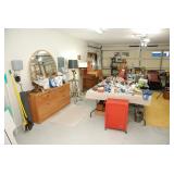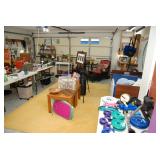 Double Garage – features a dresser with mirror, some practical hand tools, and two square wooden end tables. We have a nice adjustable easel, assorted picture frames and a small tool chest. The main carpeted table has hand tools, a tool box, Oster clipper, gloves, cleaning brushes, and a lamp without shade. There are so many items on this large surface you are likely to find many useful items. We have a very nice metal four prong plant hanger on a stand. There are two nice outdoor patio chairs with matching ottomans along with outdoor pillows. We also have a small round table. If you are looking for pots, we have a lot from small to very large ceramic. Come early for the best selection. We have a “farmers table” with drawer in good condition and a small metal shelf, some small step stools, and a six foot aluminum ladder. There is a nice assortment of collectable wooden boxes, vintage suitcases, and a small two drawer chest. There is also a nice floor lamp with shade (BNI) and a metal table with a nice Cherub lamp with shade (BNI). On top of the dresser there are many types of electric fans including some vintage. We also have a vintage metal milk bottle case, some plastic storage bowls with covers, and some smaller exercise equipment / helpers (mostly hand held items). There is also a larger gray shower chair, adjustable canes, and a “getting out of bed” helper that attaches to a bed. Look behind the garage entrance door for cleaning helpers and solutions.