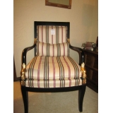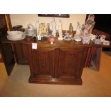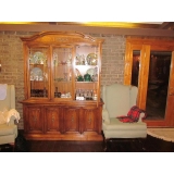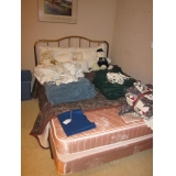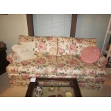 3 different floral Ethan Allen Sofa's, 2 green wing back chairs, 2 nice Curio cabinets w/ beveled glass, Ethan Allen black and gold arm swan chair, Red leather wing back chair, Dinning room table w/8 chairs, China Cabinet, Buffet server table, Bamboo wood table w/ glass top and 4 bamboo chairs, Brass Queen headboard w/ mattresses, Dresser,