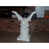 Miscellaneous: Floor fan, Sharper Image cylinder fan, Gargoyle table bottom, paper cutter, cast iron cooking pot w/bale, straight back brown metal chair, artificial greenery, wooden bread box,