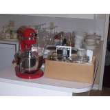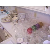 Various: dishes, serving pieces, pots & pans, cannister set, corning dishes, covered casseroles, chafing bowls, stem ware, covered terra cotta dish, crystal cake stand, taco holder, chip & dip, cake carrier, Pasta bowl, Lenox soup tureen w/ladle, measuring cups, spring form pan, bundt pan, serving bowls, glasses, shot glasses, pyrex bowl & dish, pie plates, covered casseroles, Stainless skillet w/lid, stainless egg poacher, paper towl holder, lenox stoneware, cups, ramkins, cake pans, stemmed bowls, small clock, tri-pillow, small pillow, jewelry cleaner, Milk Bone cannister, decorative bowl, wooden bowls