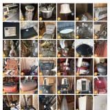 Singer Sewing machine & supplies Oak entertainment center, lots of storage Loveseat 2 leather recliners Lowrey organ, sheet music Floor lamp with glass table TV Retro hanging lamps 2 glass curio cabinets (5 feet tall) 2 floor speakers Large wall mirror