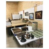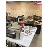 Antiques/Collectibles: Primitive Farm Tools, Enamelware, Art Pottery, Art Glass, Pink Depression Pieces, Blue Canning Jars, Vintage Kitchen Utensils, Oil Lamps, Vintage Pyrex Bowls, Stoneware Crocks and Bowls, Old Bottles, Vintage Framed Prints, Hand Painted Porcelain Chocolate Set, Child’s Box Wagon, Ammo Box, Griswold Skillets, Tin Dutch Windmill Sand Toy, Other Vintage Toys.