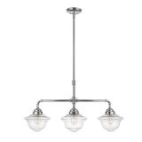 McGrath Pendant. Number of Lights: 3. Finish: Chrome. Lumens: 2400. Voltage: 120. Can be used above a kitchen sink that has a wide double window. Fixture 21'' H x 36.5'' W x 9.75'' D. Shade 7.5'' H x 9.5'' W x 9.5'' D. Overall Height (Hanging) 75 ''. Canopy Diameter: 5.75". Minimum Hanging Height: 21". NEW IN FACTORY CARTON, PREVIEW FOR COMPLETE SATISFACTION. RETAIL PRICE $477.00 **(26)** |