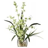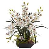 Cymbidium Orchid Arrangement in Vase. Product Type: Floral Arrangement. Flower Color: White. Materials: Plastic, polyester, iron wire, glue, fiber clay and styrofoam. Overall 36'' H x 29'' W x 29'' D. Vase 14'' D x 14'' W. Vase: 5.25" H. Base Color: Black. Primary Material: Silk. NEW IN FACTORY CARTON, PREVIEW FOR COMPLETE SATISFACTION. RETAIL PRICE $199.99 **(13)** |