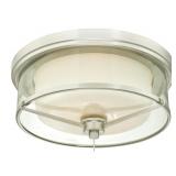 Johns 2-Light Flush Mount. Finish: Brushed nickel. Comes with frosted and clear glass. UL/CUL Listed. Bulb type: 60W Medium base bulb. Fixture 5.39'' H x 12.99'' W x 12.99'' D. Power Source: Hardwired. Assembly Required: Yes. NEW IN FACTORY CARTON, PREVIEW FOR COMPLETE SATISFACTION. RETAIL PRICE $115.35 **(31)** |