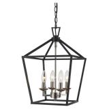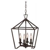 Carmen 4-Light Pendant. Finish: Rubbed Oil Bronze. Replaceable Bulb Included: No. Bulb Type: E12. Wattage: 60W. Primary Material: Metal. Canopy Included- Height - Top to Bottom 0.87 ''. Width - Side to Side 5 ''. Hanging Method- Wire Length- 120 ''. Other Dimensions- Fixture 15.5'' H x 12'' W x 12'' D. Overall Height (Hanging) - Minimum 23.5 ''. Overall Height (Hanging) - Maximum 114 ''. Cage height: 16". Chain link height: 2". Wire Length: 120". Width of the top rectangle: 12". Width of the bottom rectangle: 8.75". Installation Required: Yes. NEW IN FACTORY CARTON, PREVIEW FOR COMPLETE SATISFACTION. RETAIL PRICE $169.10 **(34)** |
