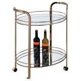 Livia Bar Cart. 2 Shelves. Frame Color: Champagne. Shape: Oval. Raised guard rails. Dual cart handles. Caster wheels. Top Material: Glass. Overall 31'' H x 26'' W x 18'' D. Shelf 0.2'' H. NEW IN FACTORY CARTON, PREVIEW FOR COMPLETE SATISFACTION. RETAIL PRICE $132.99 **(42)** |