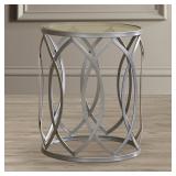 Bellanger Metal End Table. This silver metal with glass top End Table adds just the right amount of transitional appeal with its geometric styling. Overall 20.13'' H x 16.25'' W x 16.25'' D. NEW IN FACTORY CARTON, PREVIEW FOR COMPLETE SATISFACTION. RETAIL PRICE $99.99 **(73)** |
