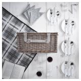 Deluxe 4 Person Traditional Wicker Picnic Basket. Includes 4 cotton napkins, 4 stainless steel knives, 4 stainless steel forks, 4 stainless steel spoons, 4 dinner plates, 4 plastic wine glasses, 2 salt & pepper shakers and 1 bottle opener. Gray gingham lining and contrasting fasteners and handles. Overall 16.3'' H x 12'' W x 8.7'' D. Basket size: 15.7” H x 11” W x 7.9” D approx. NEW IN FACTORY CARTON, PREVIEW FOR COMPLETE SATISFACTION. RETAIL PRICE $69.99 **(82)** |