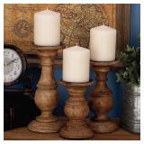 3 Piece Wooden Candlestick Set. Made from mango wood, Overall Large 10'' H x 4.5'' W x 4.5'' D, Medium 8'' H x 4'' W x 4'' D, Small 6'' H x 4'' W x 4'' D. NEW IN FACTORY CARTON, PREVIEW FOR COMPLETE SATISFACTION. RETAIL PRICE $47.00 **(99)** |