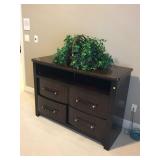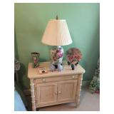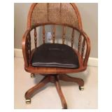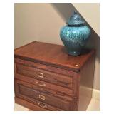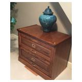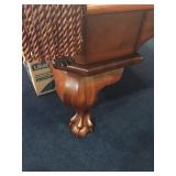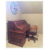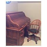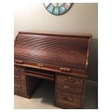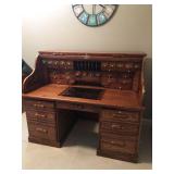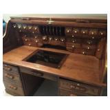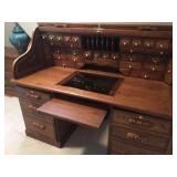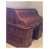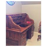 SOLID HAND CARVED OAK ORNATE ROLL TOP DESK WITH COORDINATING TWO DRAWER STORAGE UNIT.