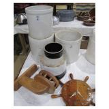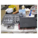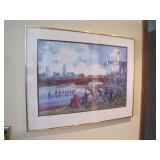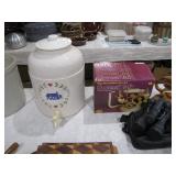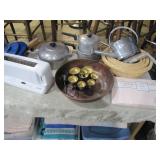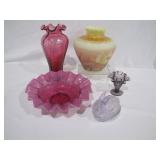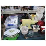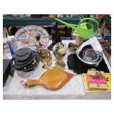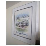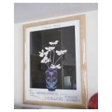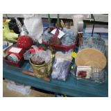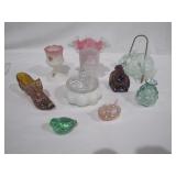 Fostoria, Diamond, Central and other elegant glassware; Fenton Connoisseur Collection Seascape vase plus other collector Fenton pieces; an original Elika Laborious stainless steel designer clock; Thomas Rebek watercolor print; Windjammer Gallery & other Bermuda framed prints; kitchenware; crocks; household; bed linens; Northwest Airways postal scale;