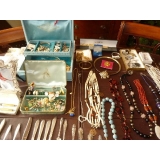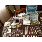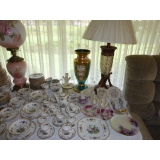 Other: Silver plate items, costume jewelry, sterling spoon collection, Sterling silver coins, Republican and Democratic coins, coin collecting books, stamp collection, Anri figurines, Thorens music box, decorator art, vintage hotel mailbox covers, lamps, columns and pedestals, Ann Hathaway’s cottage in watercolor, W M Thompson print, stain glass window, Royal Albert country rose knife set, hat pin holders, brass items, statues, Gone with the Wind lamps, Women’s clothing, wedding dress, women’s shoes size 10, nighties, purses, lucite dresser sets, receiving blankets, newborn to 9 month old baby clothes, lamb wool rug, curtains, knick knack shelf, linen, napkin rings, aprons, tablecloths, hankies, watch collection, Lenox bird collection, rotary telephone, binoculars, diaries, cribbage boards, dominos, board games, perfume bottles including Nina Ricci, Emerson radio/turntable set, trinket and jewelry boxes, books, embroidered items, pillowcases, vintage convex picture frames, very few kitchen items, small wood keg, dolls, cards, greeting cards, wrapping paper, piggy bank collection, picture frames, wool blankets, mink collars, Zippo lighter, Space bags, picnic baskets, craft supplies, candles, plants, holiday items for every occasion, live plants, planters, concrete planters, yard art, bird bath, large concrete fountain, …