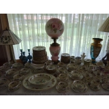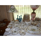 Glass, Pottery & China: Crystal lamps,Lladros, Myott Meakin platter, Goebel birds, Goebel bank, hand painted china, egg collection, Limoge France dishes, crystal, pressed glass, crackle glass, Royal Paisley cream and sugar, Sadler teapot, Belleek, Lenox, Johnson Bros Tally Ho creamer, Spode Copelands (Peplow) large dinnerware set, one carnival glass bowl, glassware and more …