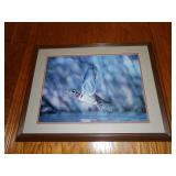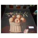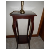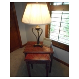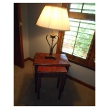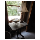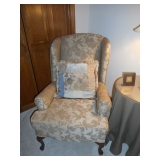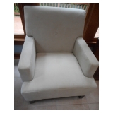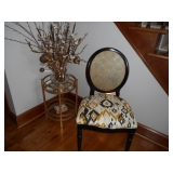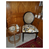 Living room furniture including fabric couch, coffee table, end table, designer side chair